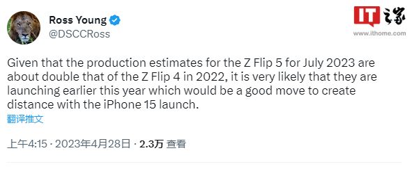IT之家 4 月 28 日消息,三星正准备在 7-8 月推出其下一代折叠屏手机设备,包括 Galaxy Z Flip5 和 Galaxy Z Fold5。现在显示屏分析师 Ross Young 分享了一些早期估计,声称将三星 Galaxy Z Flip5 的产量将是去年 Z Flip4 的两倍。