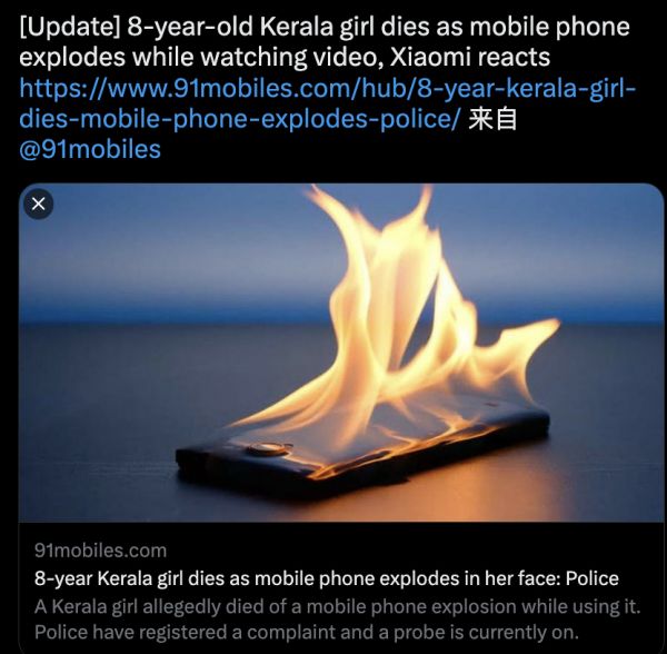 据警方称,在另一起智能手机起火事件中,喀拉拉邦一名 8 岁女孩据称在看视频时使用的手机爆炸,导致她死亡。据报道,上周北方邦巴端的一名男孩在手机充电时因触电而死亡。几个月前,中央邦乌贾因区的一名男子因据称手机电池爆炸而死亡,这是另一起与智能手机相关的伤亡事故。