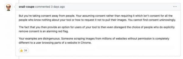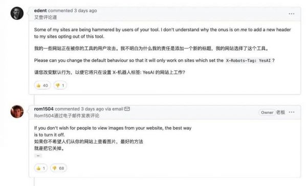 这段对话来自图片抓取工具 Img2dataset 的 GitHub 页面,争论的双方,是被抓取图片的网站站长 Eden,和抓取工具的开发者 Romain。