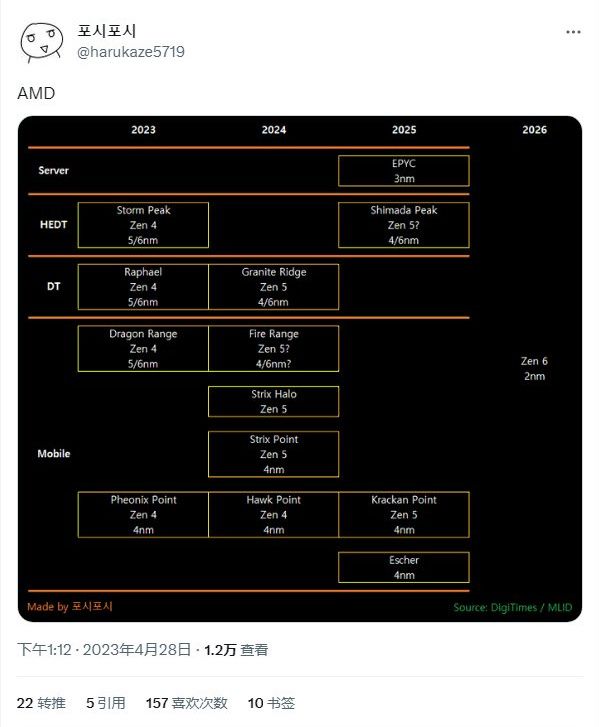 IT之家 4 月 29 日消息,国外网友 @harukaze5719 整理 DigiTimes 的相关报道数据,以及 YouTube 频道 MLID 的补充信息,制作出 AMD CPU 路线图 。