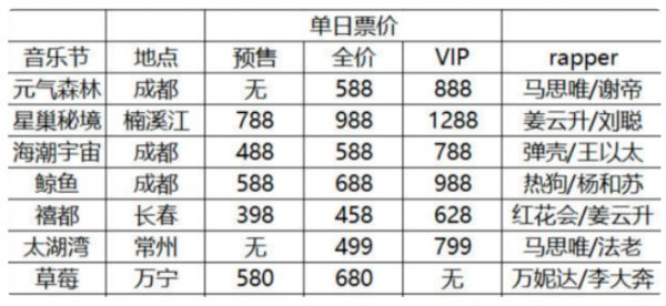 当时,温州一场音乐节的全价票卖到了988元,成都一场音乐节双日VIP通票高达2999元!