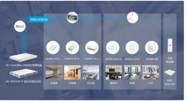 锐捷星空无线方案采用新型光电混合缆连接Wi-Fi 6 AP,可同时实现室内1100米远距离、高带宽数据传输和PoE点对点供电,实现光纤链路的性能释放。支持智分模式和普通模式切换,适用多种场景的无线光网络搭建。