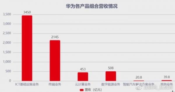 这是去年华为各业务营收情况图,可以看到华为的营收大头是ICT基础设施业务,主要也就是运营商的5G、4G等业务。其次是终端业务,再是云计算、数字能源业务、汽车业务和其它。