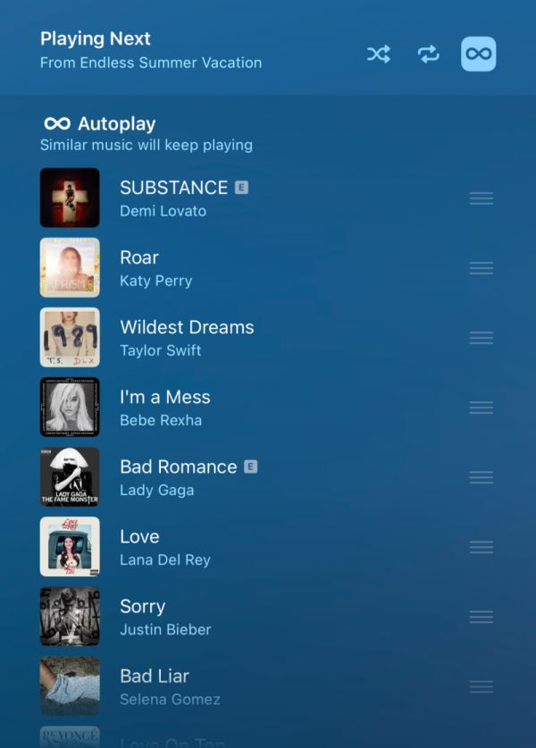 包括 Apple Music,早期极力宣传自己的歌单都由真人编辑,而非算法生成。但在 2021 年,苹果也推出了自动播放功能。这个功能与 Spotify 的算法系统类似,会在用户播放一张专辑、歌单后,继续自动播放算法推荐的歌,无限续播下去。