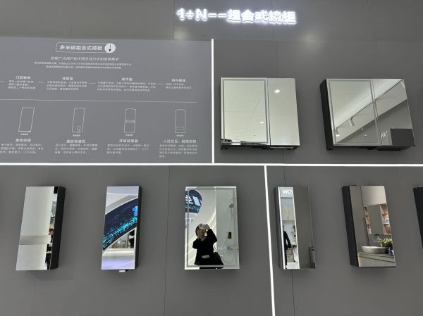 组合模块是卫浴套系化的一个关键词。箭牌家居展出的DOMINO组合式智能镜柜,具备自适应灯光、自动除雾等基础功能外,“模块化”集成了美妆冰箱、皂液机、牙刷消毒器,按需自由搭配、定制组合,来打破洗面台的独立元素。