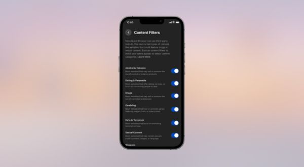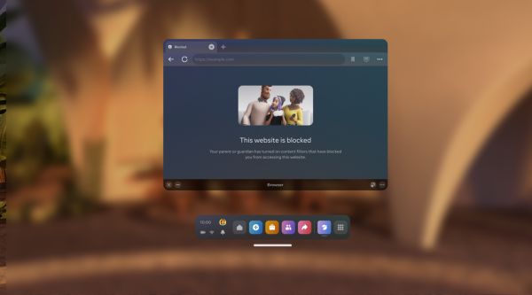 对于家长用户来说,新系统还有一项实用功能,就是在 Quest 浏览器中增加了网站过滤选项,家长可以为孩子屏蔽某些特定类别的网页,而且该功能是与账户而非 VR 设备绑定,因此在 Quest 手机应用的家长监督选项里就可以进行设置。