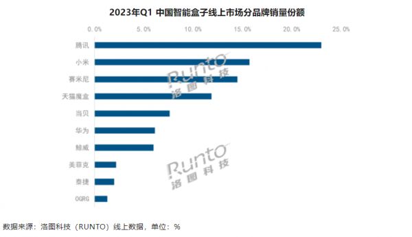 从月度上看,1 月销量超过 25 万台,2 月和 3 月均不足 16 万台;从同比上看,三个月的销量同比呈现双位数下滑,降幅在 25%-35% 之间。IT之家从洛图科技线上数据获取到,一季度智能盒子线上市场 TOP4 品牌为腾讯、小米、赛米尼、天猫魔盒,CR4 为 65.1%,同比上涨 8.5 个百分点。