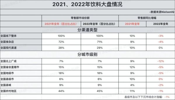 尼尔森2022年国内饮料大盘零售额数据显示,2022年,北上广等一线城市零售额同比下滑超过10%,而现代渠道和县级市城市零售额则较上一年同比持平。全国农村地区零售额市场份额超过45%,且在所有出现下滑的城市级别中,下滑幅度最小。