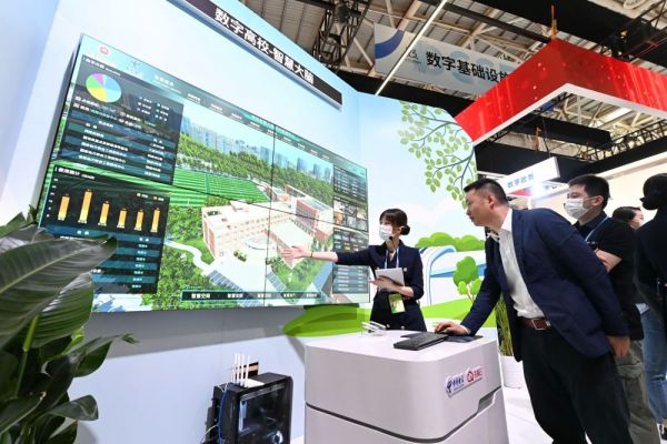 4月26日,数字福建建设成果专区工作人员在第六届数字中国建设成果展现场向参观者介绍数字高校智慧大脑综合管理平台。新华社记者林善传 摄