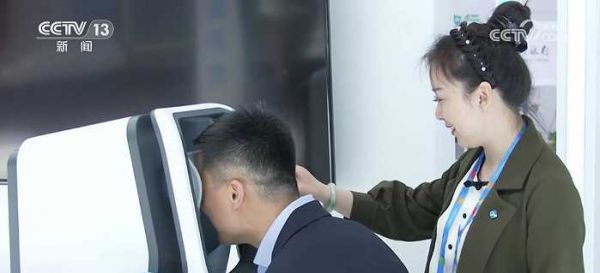 在数字社会展馆,一台视网膜筛查系统吸引观众的体验。现场通过给视网膜拍照,通过AI技术自动分析视网膜血管、神经,评估全身血管的健康状况,只要1分钟即可出报告。