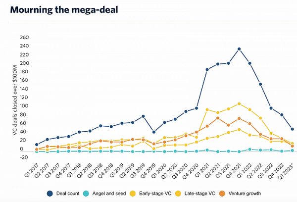 VC交易规模在一亿美金以上的交易数量近期呈陡崖下降 图源:Pitchbook