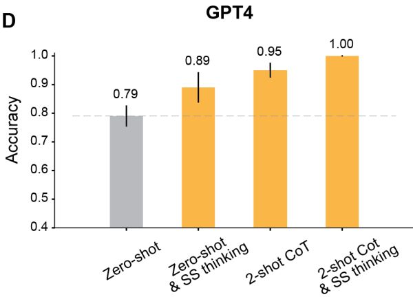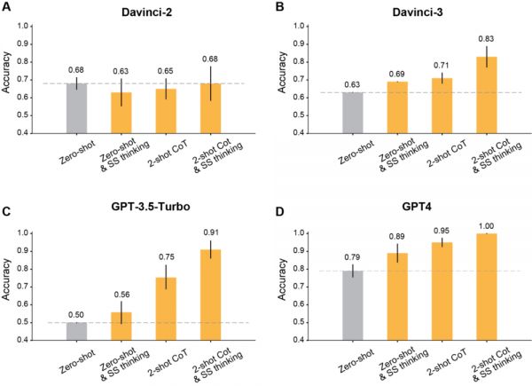 结果显示,这种step-by-step思维提高了Davinci-3、GPT-3.5-Turbo和GPT-4的表现,但没有提高Davinci-2的准确性。