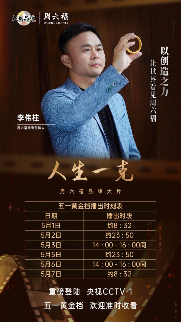 周六福品牌大片《人生一克》今日于CCTV-1重磅首播,邀你共同见证人生的每个黄金时刻!