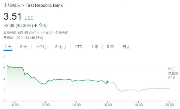 受关闭消息影响,第一共和银行美股盘前一度跌近60%,并于美股盘前停牌,停牌前跌近46%。上周五因救助前景黯淡,第一共和银行收跌43%。