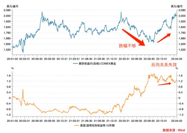 更特殊的是,在随后的2022年11月至12月,黄金价格已不只是抗跌,而是和实际利率走势开始显著同步——实际利率明显反弹,黄金本该下跌却依旧单边上行,两者从跷跷板几乎变成了并排跑。