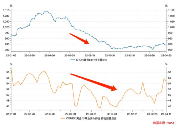 但这个猜想和现实并不相符,从真实的机构行为来看,机构投资人在2022年其实是看跌黄金的。从持仓比例上看,2022年无论是全球最大的黄金现货ETF,还是COMEX黄金期货非商业持仓多头占比,在 2022年都是下滑趋势。显示常规机构在持续减仓。