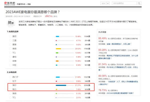 凤凰网科技讯 5月1日下午消息,全球三大消费电子展之一的AWE2023(中国家电及消费电子博览会)已在上海落幕,海尔、格力、海信、长虹、TCL等众多家电巨头在此期间纷纷拿出各自的拳头产品,凤凰网科技基于家电品类和网友对参展商的品牌满意度做了调查。
