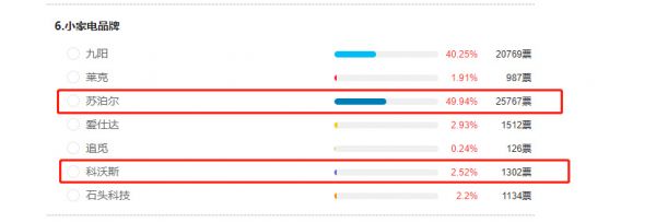 小家电品牌满意度方面,截至24小时调查结果显示,苏泊尔获得49.94%的网友投票,科沃斯获得2.52%的网友投票。