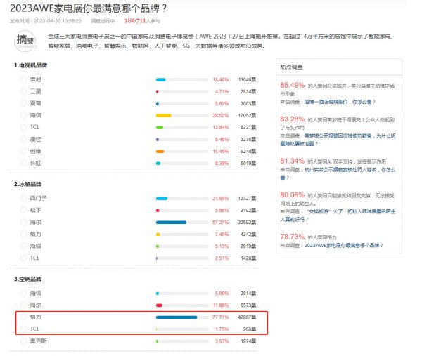 空调品牌满意度方面,截至24小时调查结果,格力获得77.71%的网友投票,TCL获得1.75%的网友投票。