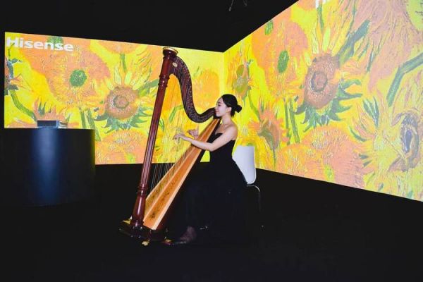 在激光场景展中,观众可以在梵高的画作中遨游,从无垠的星空,到热烈盛开的向日葵,再到无边无际的麦田,身临其境地欣赏梵高一生的创作。感受梵高天才的艺术天赋后,观众还能在梵高展前听一场竖琴表演,古典音乐与西式古典油画融为一体,带给观众不可多得的沉浸式优雅艺术体验。