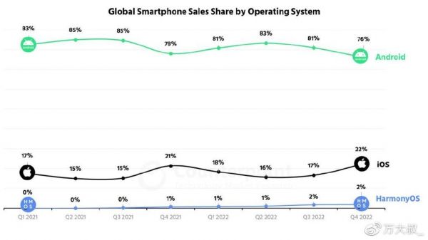 操作系统方面,微软的windows垄断了PC领域,谷歌的安卓和苹果的IOS垄断的智能手机领域。那么在电脑操作系统方面,国产操作系统已经有了较大的进步,目前在一些特殊的机构和部门,已经可以完成国产化替代。手机操作系统方面,华为鸿蒙崛起,已经与安卓和ios形成三足鼎立之势,虽然市场占有率方面还有较大的差距,根据Counterpoint Research发布统计数据显示,到2022年四季度,华为鸿蒙的全球市场占有率2%,中国市场占有率8%。但是鸿蒙是一个分布式操作系统,可以嵌入各种硬件设备,将来它的发展一定是跨越式的。