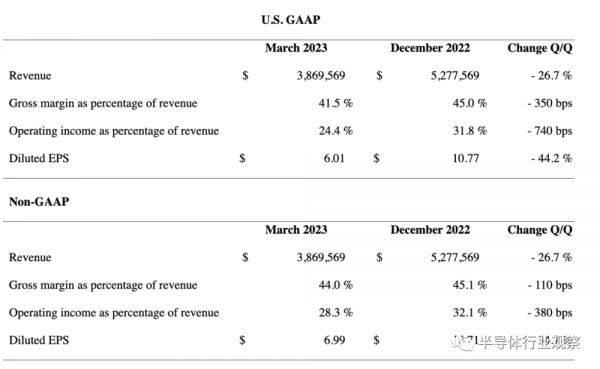 Lam Research主要生产半导体沉积、蚀刻和清洁等设备。Lam在2023年第一季度取得了相对稳健的业绩,包括创纪录的代工相关收入,其内存安装基数与上一个下降周期相比增长了近 40%。该季度收入为38.7亿美元,相比于上一季度环比下降26.7%。毛利率为16.06 亿美元,占收入的 41.5%,营业费用为6.63 亿美元,营业收入占收入的 24.4%,净收入为 8.14亿美元。