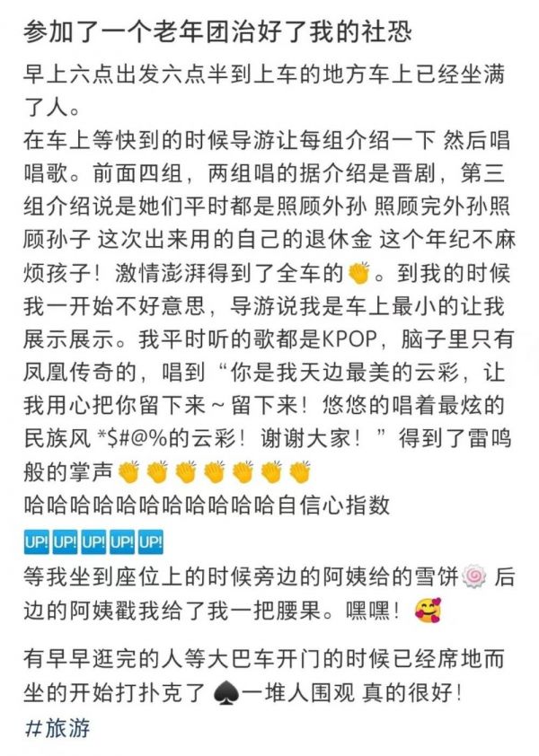 △在老年团旅游的过程中,年轻人体会到“i人变e人”的过程。/小红书@YaN_G