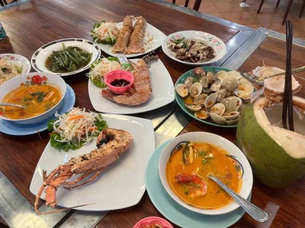 海鲜市场里各种海鲜活蹦乱跳,我们买了龙虾、皮皮虾、黑虎虾等,老板开价2800泰铢,我们砍价到1500泰铢(人民币300元左右),最后做出了8道菜,算上加工费,人均不到200元实现了海鲜大餐自由。