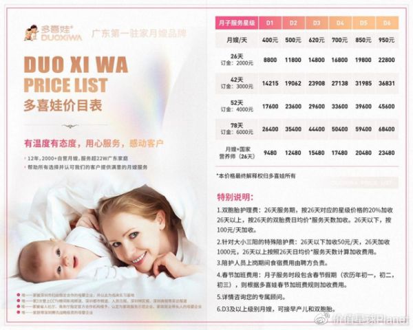 “她们的服务,你是不知道有多好”,采访中,梵仔给价值星球转发了一堆资料过来,有和月嫂顾问的聊天记录,还有对方的各种服务项目、收费标准。