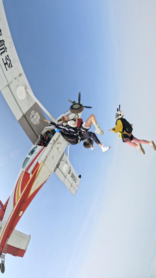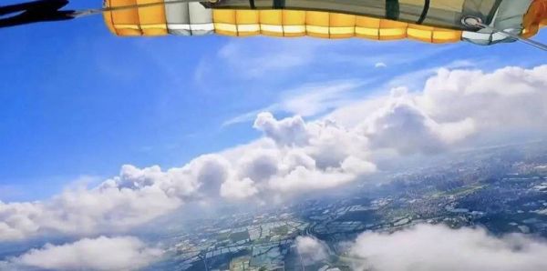 “我们的那架飞机都坐满了,我是第一个跳的,根本来不及害怕,出舱的时候,直接就跟着教练的‘321’,跳下去了。出舱后,先是几十秒钟的失重感,身体急速下降。当穿越云层的那一刻,教练开了伞,仿佛在空中来了个‘急刹车’,这时候,就可以尽情地、自由地享受天空的美景了。”