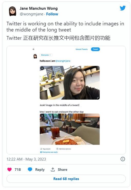 逆向工程师 Jane Manchun Wong 表示 Twitter 已经开始研究在长推文中间包含图像的能力。IT之家注,效果很像一个在段落之间有图像的博客,使长推文更有趣。