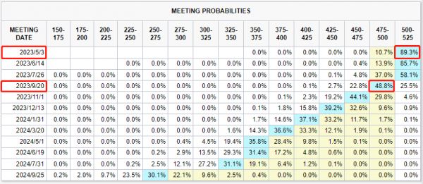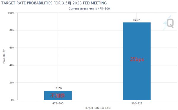 另外,目前期货市场预计今晚加息25个基点后,美联储便将暂停加息,届时终端利率将达到5.00%~5.25%。