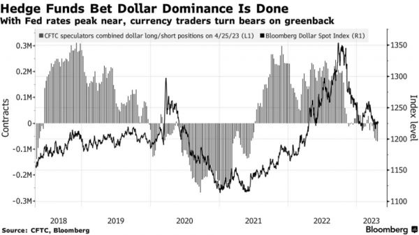 随着美联储的加息周期接近尾声,投资者已经开始纷纷做空美元。彭博社援引美国商品期货交易委员会(CFTC)的数据称,截至4月25日,对冲基金和其他大型机构投资者将美元对其他主要货币的净空头头寸增至逾7万份,为2021年6月以来新高。
