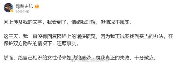 刚刚,史航回应性骚扰 :情绪我理解,情况不属实