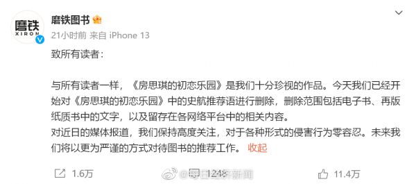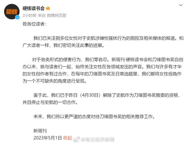 史航微博称:5月1日,网上涉及我的文字,我看到了,情绪我理解,但情况不属实。