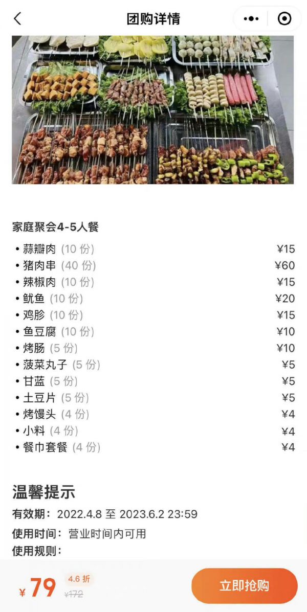 团购信息显示,一份4~5人份的烧烤套餐,只要79元。