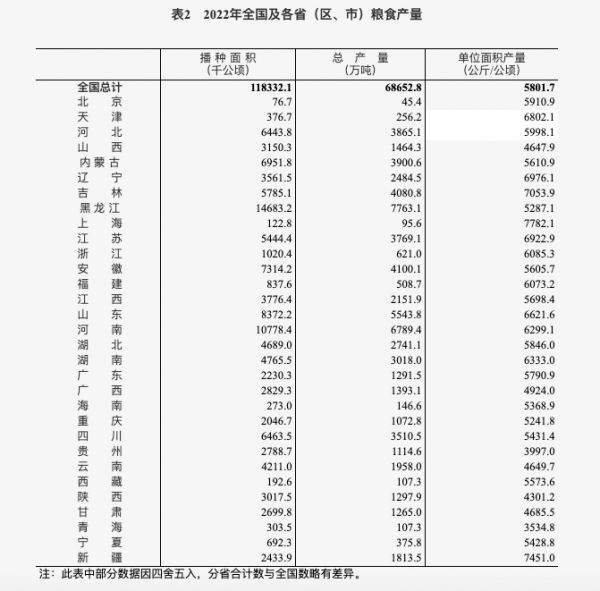 2022年全国及各省(区、市)粮食产量