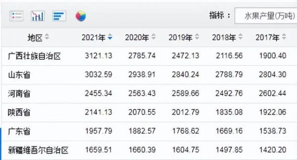2017~2021年全国部分省水果产量数据