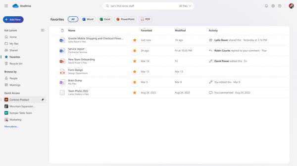 主页上的“最近”部分现在可以让用户查看所有文件,或者按照 Word、Excel、PowerPoint 或 PDF 文件类别来查看。未来用户将能够过滤视图,然后搜索特定类型的文件。微软还将在今年晚些时候添加更改任何文件夹颜色的功能。用户在 Microsoft 365 应用中标记为“收藏”的文件将出现在新的“收藏”视图中。今年晚些时候,用户还将能够在 OneDrive 中创建文件快捷链接。