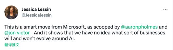 The Information 创始人 Jessica Lessin 转发文章表示,这是微软的明智之举,它也意味着,我们并不知道 AI 的业务边界在哪里。