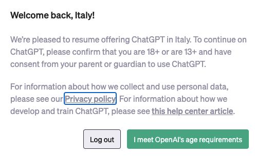 4 月 28 日,意大利解除了对 OpenAI 的限制。意大利用户在使用 OpenAI 网站时,会看到一个“欢迎回来,意大利!”的弹窗,要求用户确认他们已满 18 岁,或者已满 13 岁但在家长同意后使用。