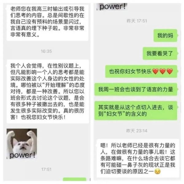 改变也是需要时间的。这两年,我陆续收到了毕业的学生发来的反馈,有女生在微博上@我,说每当她看到和性别相关的新闻发生时,她都会想起这门班会课;也有同学到了大学以后,会一直参与宣传过妇女节而不是女生节。这些学生都不是在上完课立马就发生了180度的转变。一个毕业生后来告诉我,这门班会课对她来说就像埋在心里的种子,她认为,在性别议题上但凡能影响一个人的思考,都能多少改变TA身边女性的处境——哪怕被以“开始理解”的态度对待。