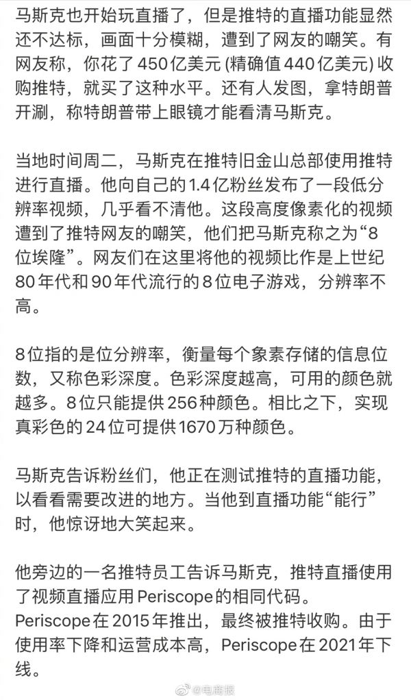 网址: 马斯克也开始玩直播了,但画面十分模糊…… http://www.xishuta.cn/newsview73457.html