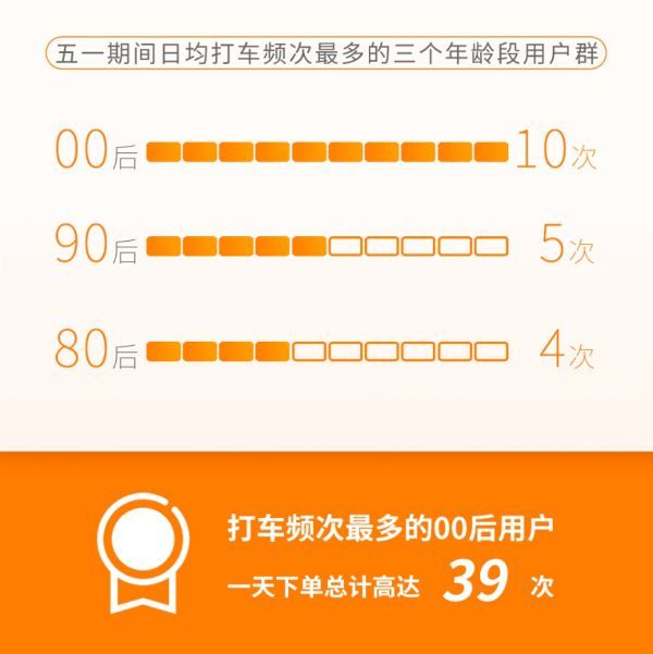 此外,在五一出行人群中,年轻人成为出行主力军。五一期间通过T3出行打车出行的用户中,00后以38%的占比,排在第一位;其次是90后,所占比例为27%;80后位居第三位,占比达18%。日均打车频次最多的三个年龄段用户群体是00后、90后、80后,分别为10次、5次、4次。