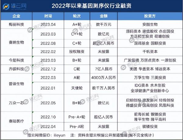 今年3月,NGS平台赛纳生物获数亿元C+轮融资,用于研发专利可控的测序仪,背后的资本方有源码资本、建信股权、亦庄国投、方正和生、荷塘创投,是继2022年8月完成由国调基金领投的投资后C+轮的又一次融资。