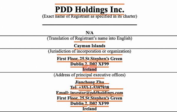 此前有媒体报道称,最近拼多多提交给美国证券交易委员会(SEC)的20-F文件显示,爱尔兰已经成为其注册地。另有最新文件显示,该公司的“主要行政办公室”在都柏林,而2月份的文件还显示该公司所列的地址是上海。