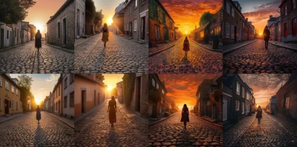 第一个提示词是“女人走在鹅卵石街道上,走向日落”: