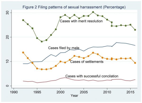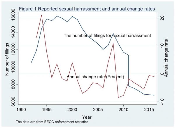 认识到性骚扰的存在似乎没有帮助解决这个问题。根据美国雇佣平等机会委员会的年度报告,在过去二十多年内,向该委员会控告性骚扰的人正在减少,从高峰1997年15889次到2016年的6758次,年均递减率达到2.3%(见下图一)。控告数目的减少并不必然表示工作环境的改善,更可能反映的是反性骚扰进展不利。大约只有14%的性骚扰案件由男性受害者提出,证明女性仍是性骚扰的主要受害群体。约26%的案件得到了有效受理,但只有10.5%的案件双方达成和解,2.2%的案件提告方得到有效的赔偿(见下图二)。对性骚扰案件的处理无力加剧了受害者的沉默。