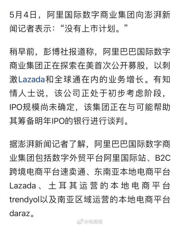 #阿里国际数字商业集团回应赴美IPO传闻# 继菜鸟、盒马、阿里云后,阿里巴巴国际数字商业集团也被曝IPO计划。阿里回应:没有上市计划。