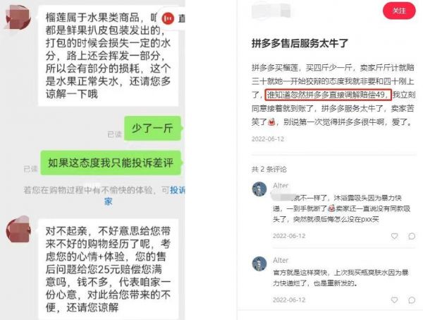 农产品的售后问题其实并不少见,在小红书等平台上有很多案例。有消费者在拼多多上买榴莲,结果到货后发现比商家承诺的少了一斤,而商家先是以运输过程中水分蒸发为由拒绝赔付,而后担心消费者投诉主动提出赔偿25元,但榴莲的售价是40/斤,消费者不满意,最后拼多多系统识别到商家未及时处理售后,为消费者退款49元无需退货。